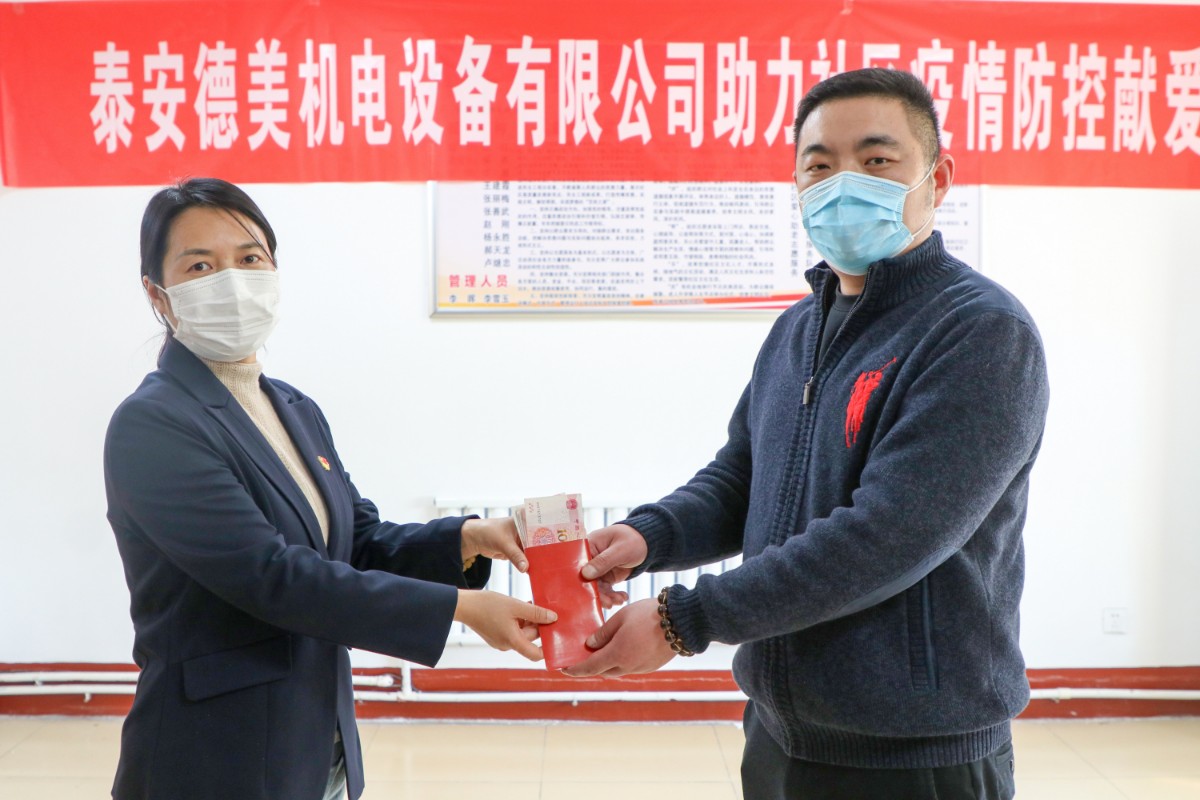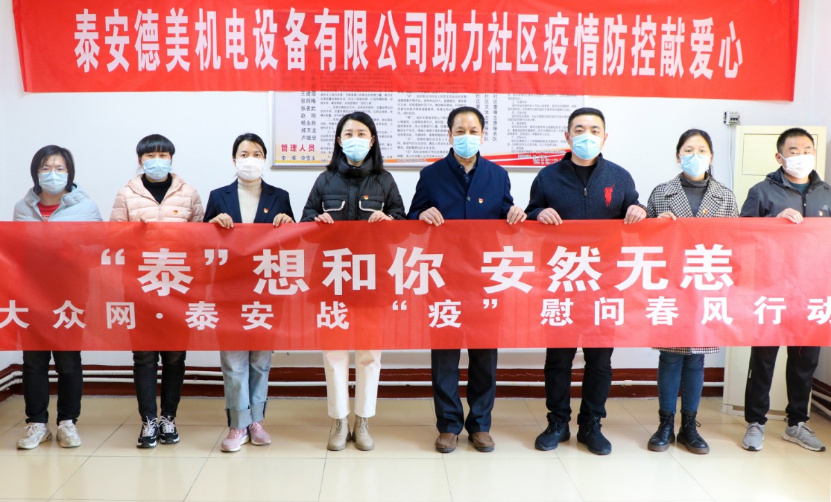在疫情防控關(guān)鍵時期,泰安德美機電設(shè)備有限公司作為泰安國際商會副會長單位、泰山區(qū)政協(xié)委員獻出愛心,通過市貿(mào)促會、區(qū)貿(mào)促會牽線搭橋,為鐵路新村捐贈防疫物資,