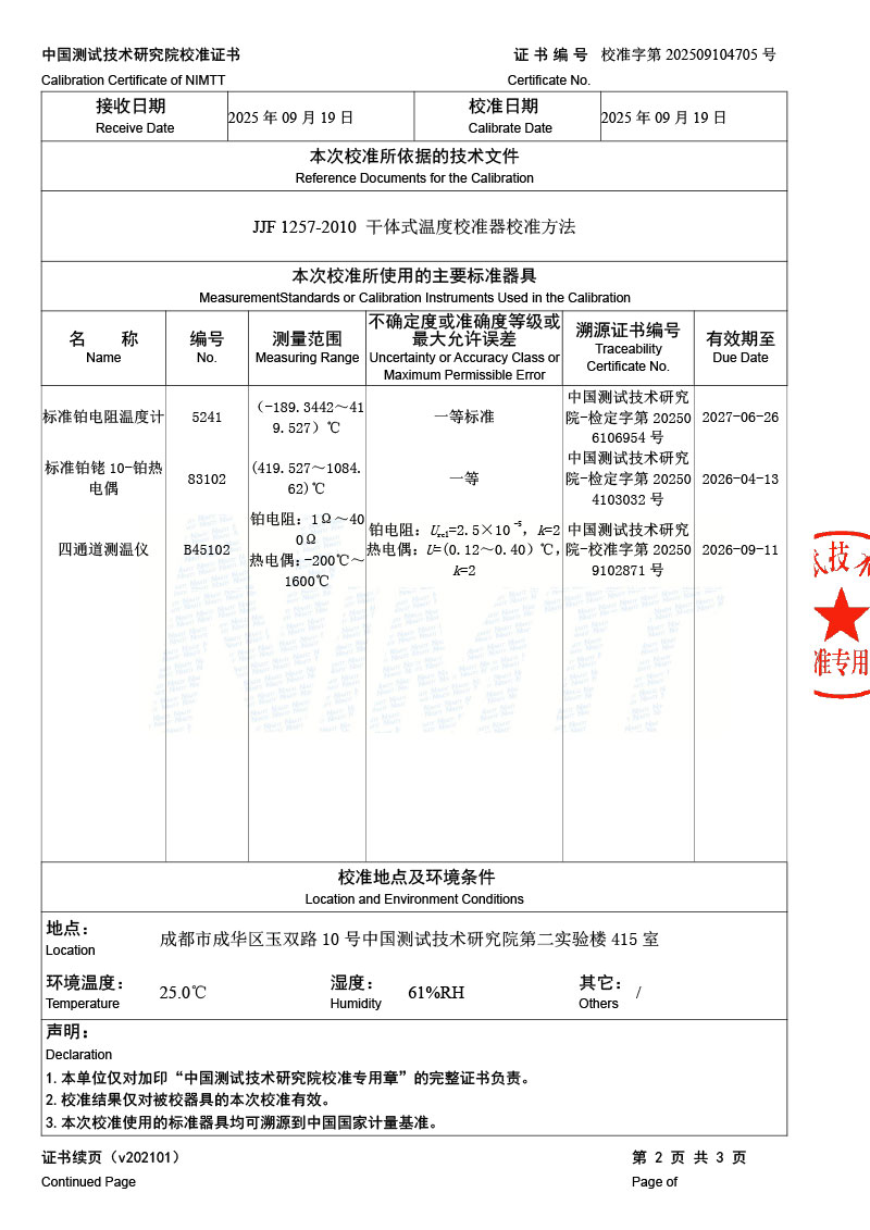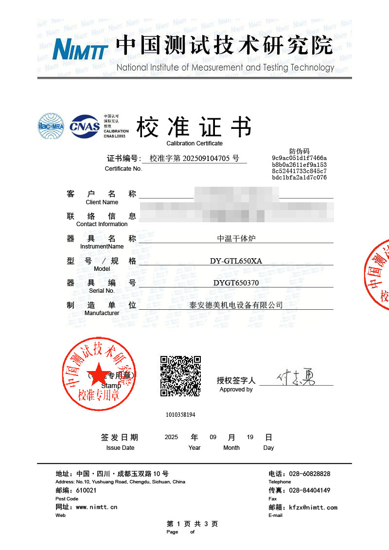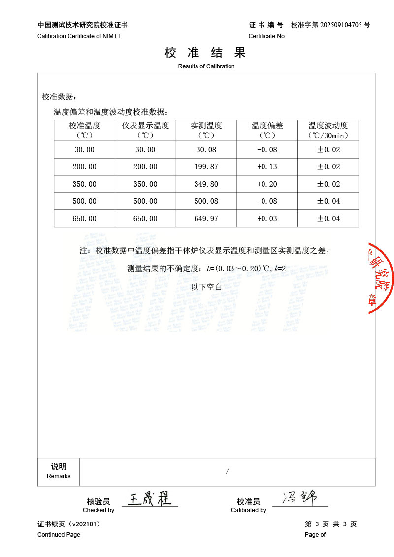 中溫干體爐(30-650℃)校準(zhǔn)證書 2025-9-22 本文被閱讀 1277 次