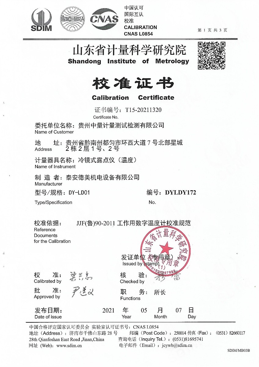 | 上一條:貴州中量計(jì)量測試檢測有限公司-冷鏡式露點(diǎn)儀檢定證書 | 下一條:冷鏡式露點(diǎn)儀校準(zhǔn)證書 |