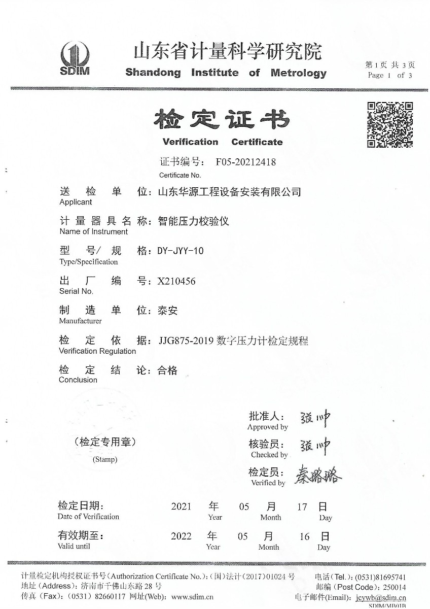 | 上一條:山東華源工程設(shè)備安裝有限公司-智能壓力校驗儀X210455 | 下一條:冷鏡式露點儀校準(zhǔn)證書 |