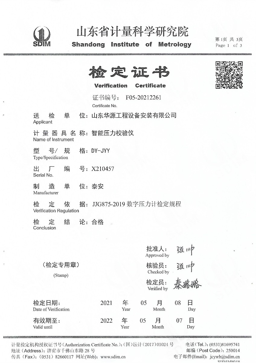 | 上一條:山東華源工程設(shè)備安裝有限公司-智能壓力校驗(yàn)儀X210456 | 下一條:冷鏡式露點(diǎn)儀校準(zhǔn)證書 |