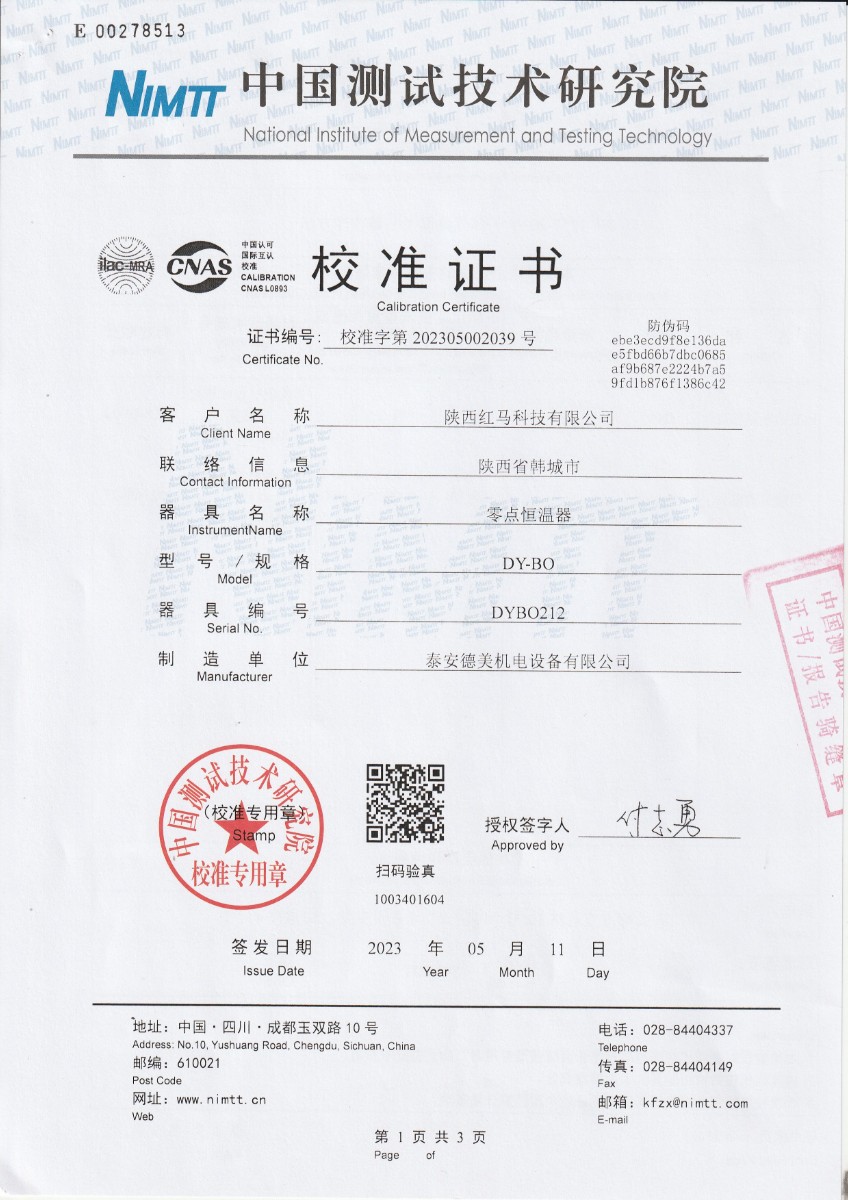 陜西紅馬科技有限公司 零點(diǎn)恒溫器 校準(zhǔn)證書 2023-5-18 本文被閱讀 10305 次