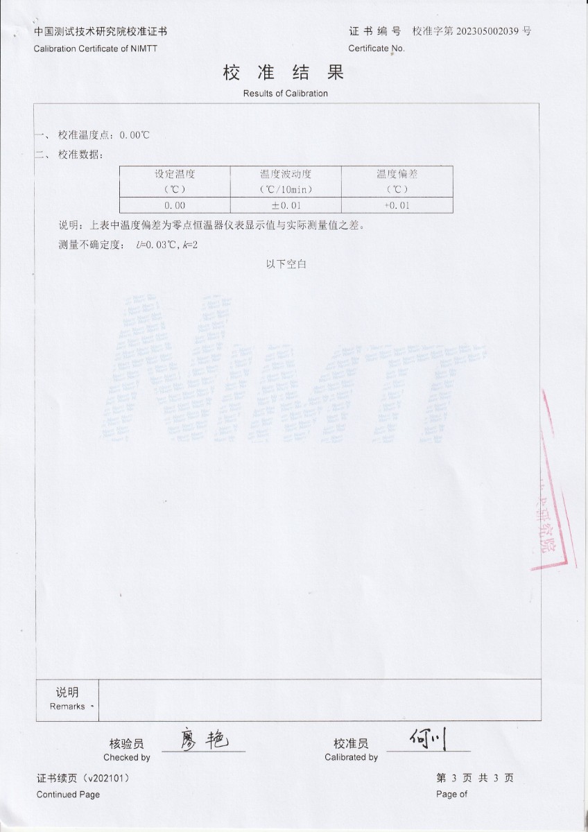 陜西紅馬科技有限公司 零點(diǎn)恒溫器 校準(zhǔn)證書